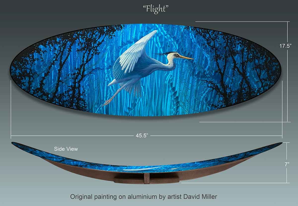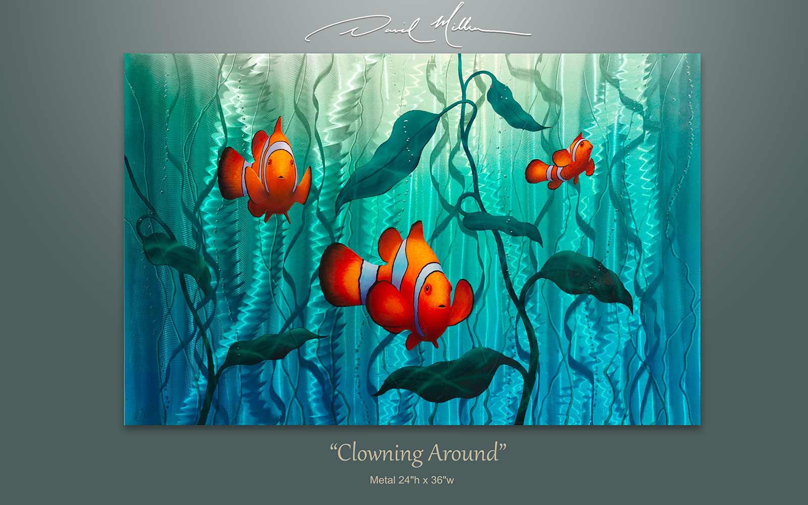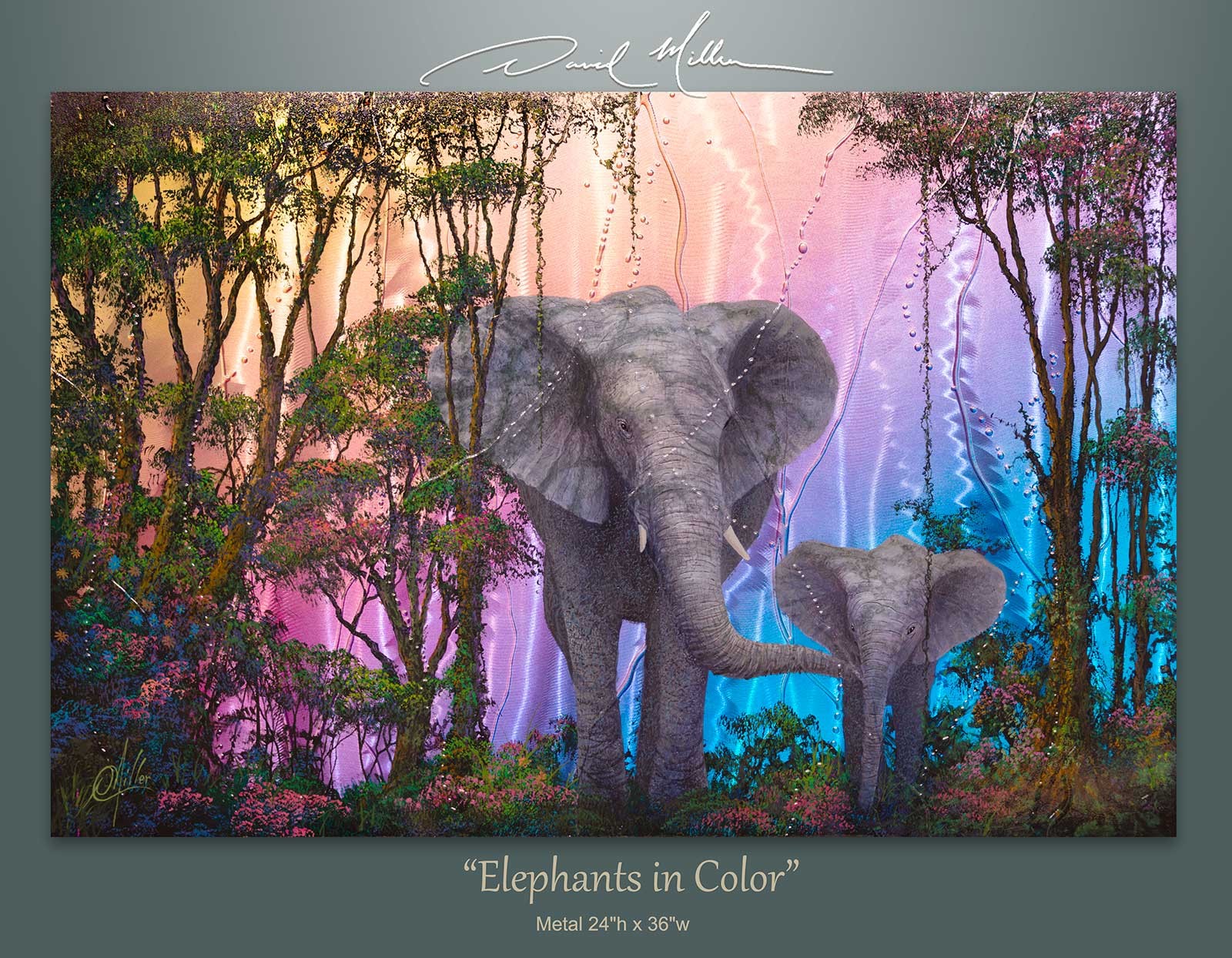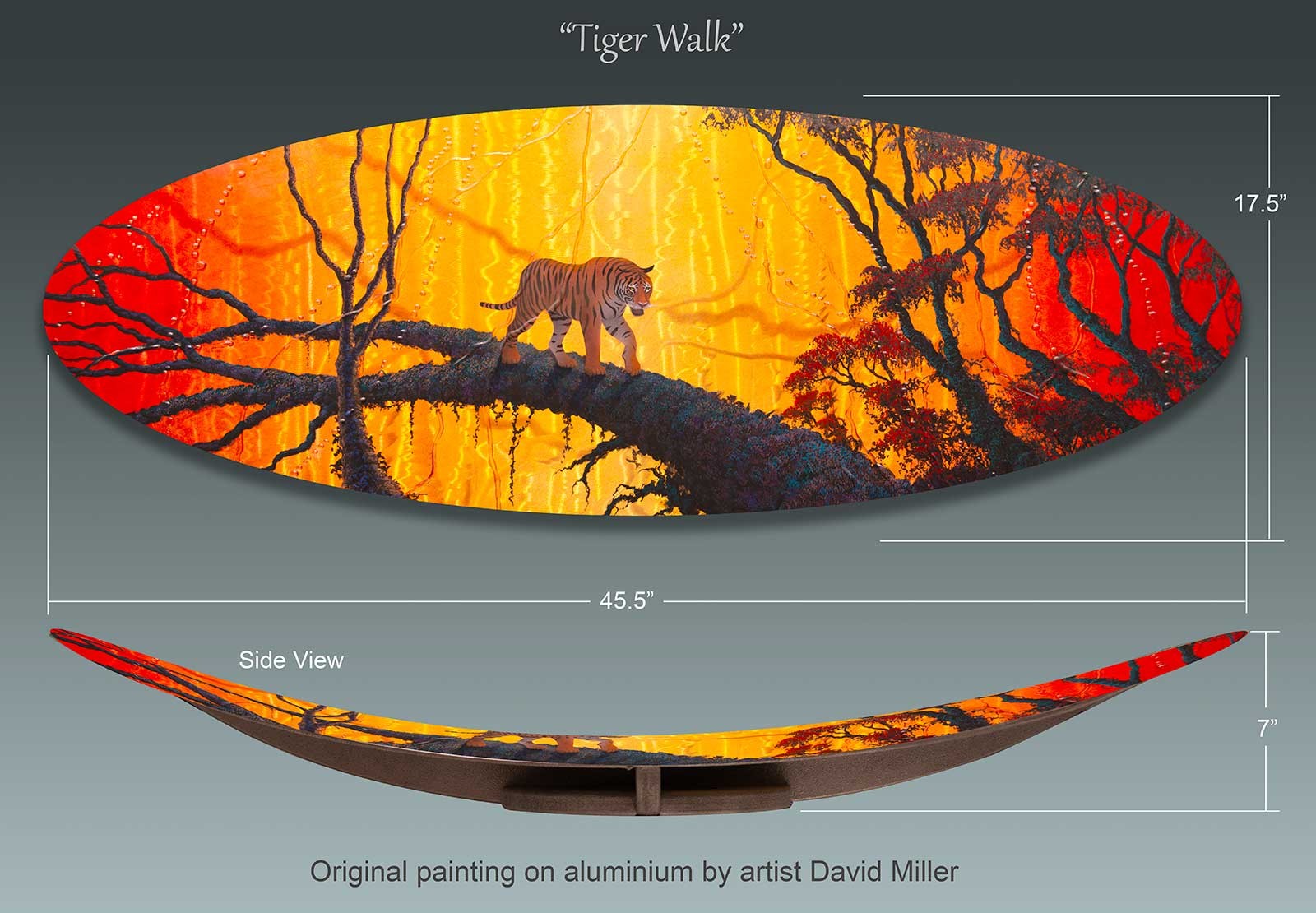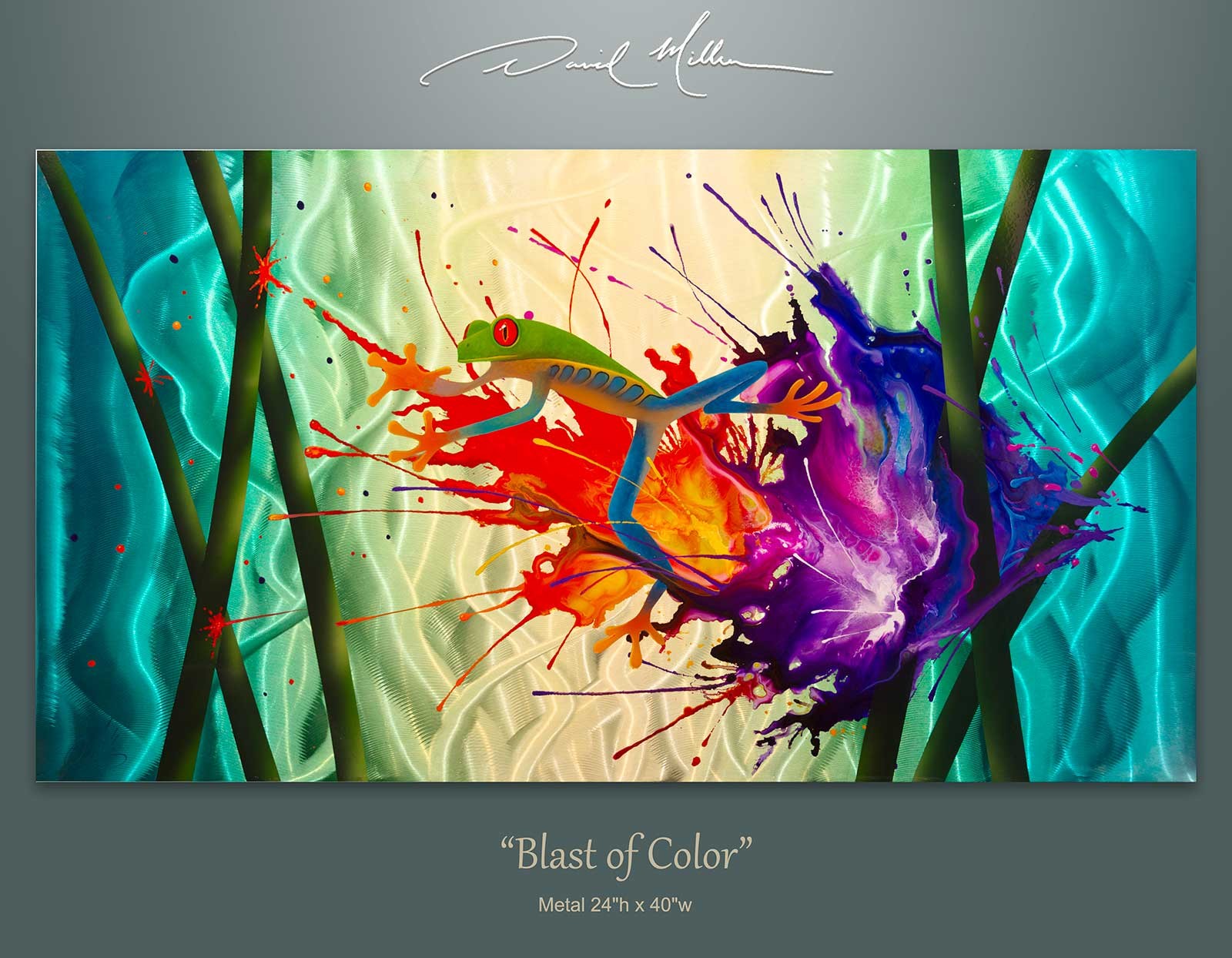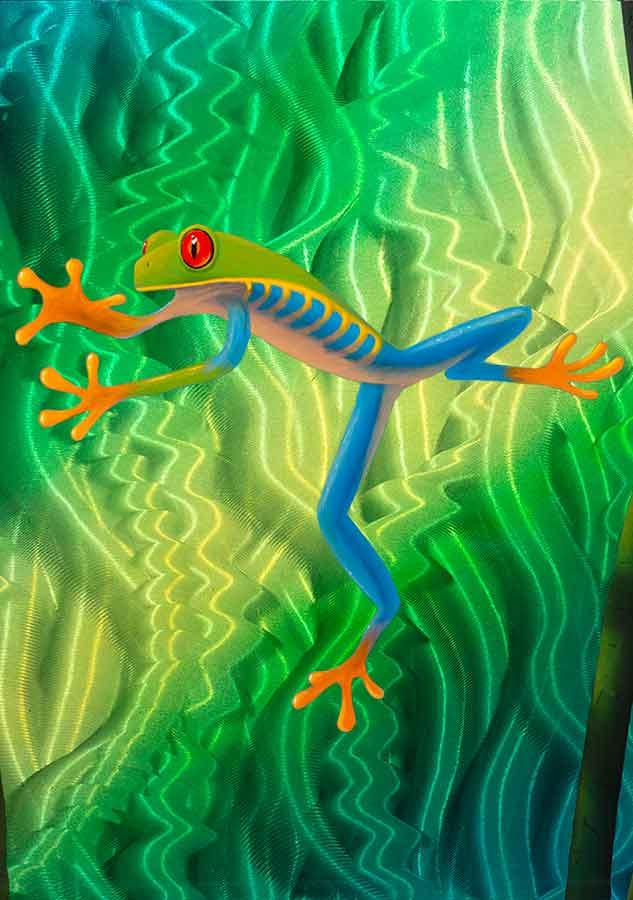 David Miller's metal art collection features stunning paintings on brushed aluminum that bring a contemporary edge to his tropical and wildlife subjects. The metal surface adds a luminous quality to the artwork, making colors appear even more vibrant. Each piece is cut into unique organic shapes that complement the subject matter, creating a truly distinctive presentation.