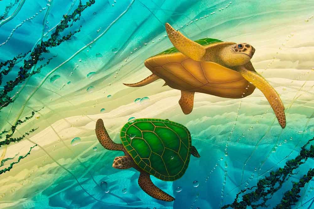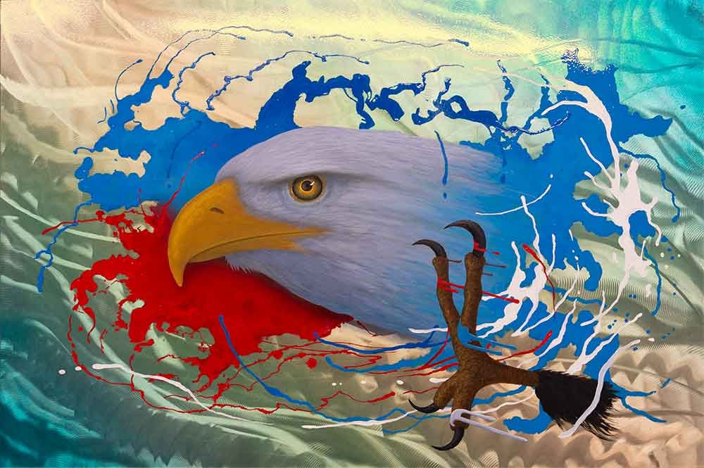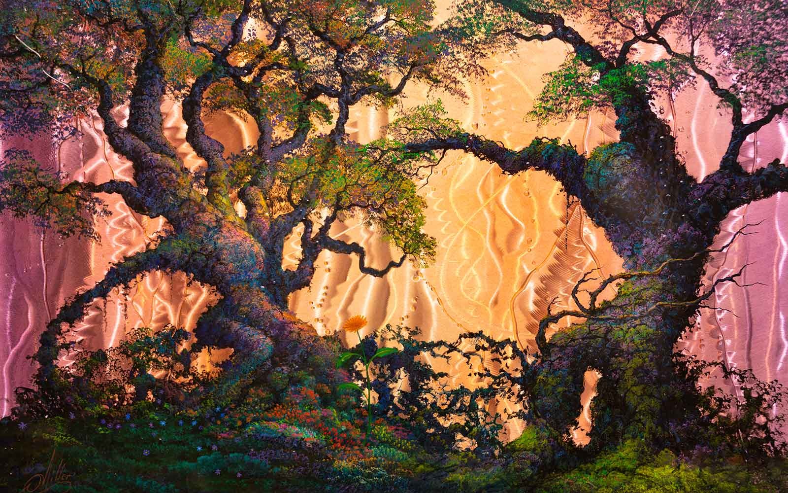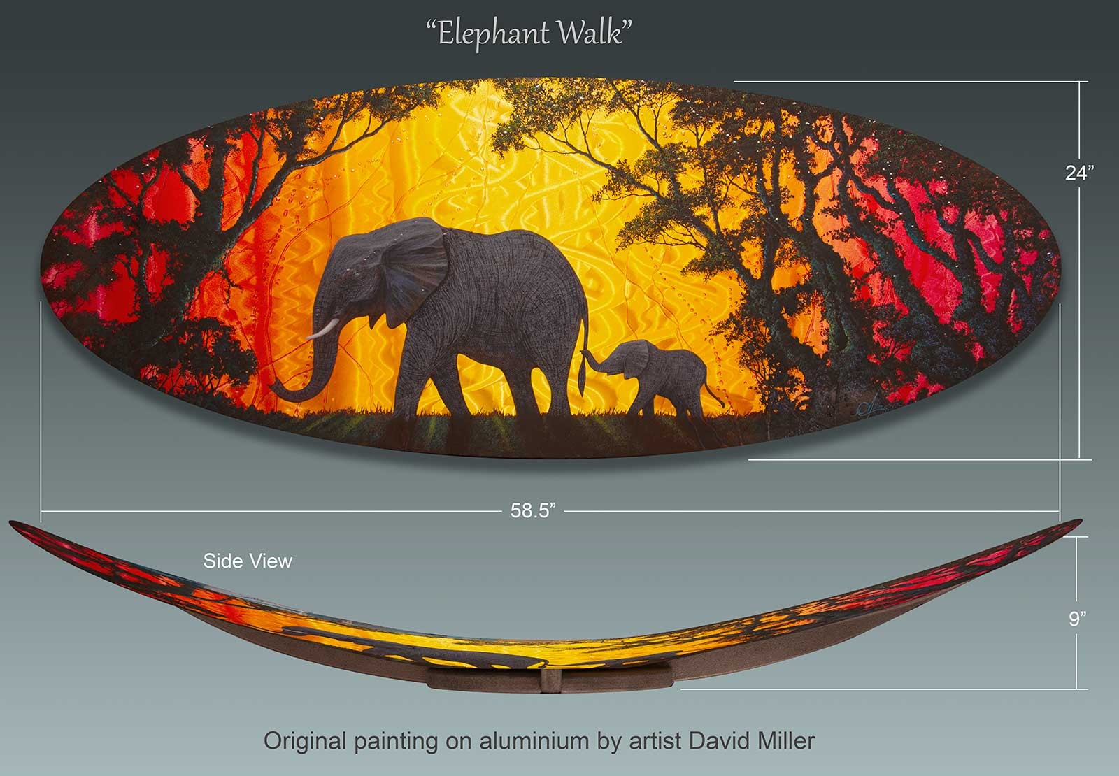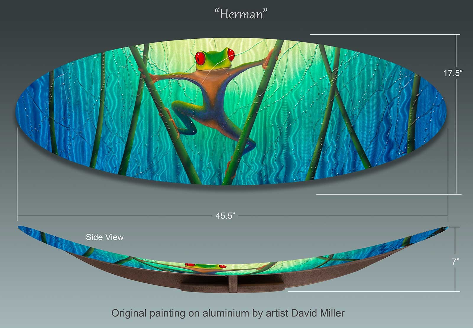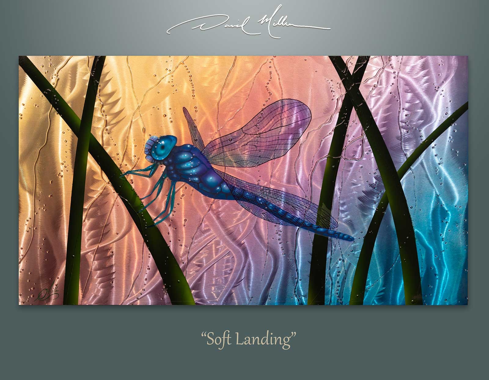David Miller's metal art collection features stunning paintings on brushed aluminum that bring a contemporary edge to his tropical and wildlife subjects. The metal surface adds a luminous quality to the artwork, making colors appear even more vibrant. Each piece is cut into unique organic shapes that complement the subject matter, creating a truly distinctive presentation.